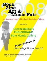 Greencup Books, Bare Hands Gallery, and The2ndHand announce the inaugural Greencup Books Book, Zine, and Music Fair, featuring local and regional writers, literary magazines, small presses, comix artists, record labels and bands, zine makers, and handmade book artists, along with live music and readings. The fair runs Friday and Saturday, November 14 and 15. Although aimed at promoting local and area talent, print and music organizations from Alabama, neighboring states, and beyond are welcome. The fair will be held at Greencup Books and at neighboring Bare Hands Art Gallery. Aside from our participants’ info and merchandise tables, the fair will feature readings from participating authors along with music each night from area bands, beginning at 7 p.m. Join us Friday night for a welcome party/reception for participating vendors, followed by a creative reading by THE2NDHAND, followed by live music. The party begins at 6 p.m. On Saturday, readings will occur periodically during the day, followed by performances and an afterparty at the bookstore. The afterparty begins at 9:30 p.m.