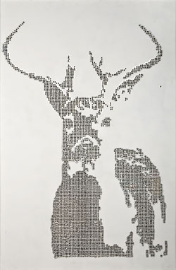 “Creel’s work investigates various aspects of Southern culture. In his recent series, De-weaponizing the Gun, Creel renders iconic images from nature with a .22 caliber rifle. The pointillist ‘drawings,’ which include a deer, a wren, and an owl, among others, are presented on four by six foot painted aluminum panels. Creel states that his recent work is meant ‘to manipulate the gun into a tool of creation.’ The irony of these dynamic images bring both humor and weight to Creel’s subject matter.” (source)